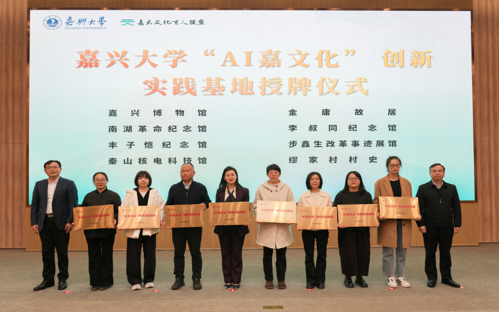 仪式上,嘉兴博物馆(马家浜博物馆)、南湖革命纪念馆、秦山核电科技馆、金庸故居、缪家村村史馆、步鑫生改革事迹展馆、丰子恺纪念馆、李叔同纪念馆8家文化场馆被授予“嘉兴大学‘AI嘉文化’创新实践基地”牌匾,标志着校地协同深化“AI+文化”育人迈上新台阶。