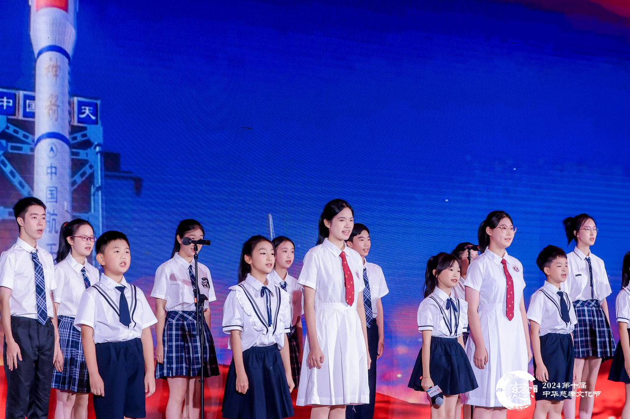 现场澳门濠江中学、杭州外国语学校的学生们登台共唱《歌唱祖国》,唱响海内外中华儿女的家国情怀。