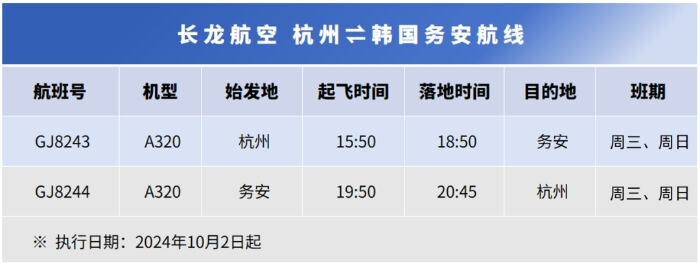 此外,10月2日起,长龙航空将新增杭州⇌韩国务安航线,一周两班,每周三、周日执行。去程航班号GJ8243,计划北京时间15:50从杭州起飞,当地时间18:50落地韩国务安;回程航班号GJ8244,计划务安当地时间19:50起飞,北京时间20:45落地杭州。