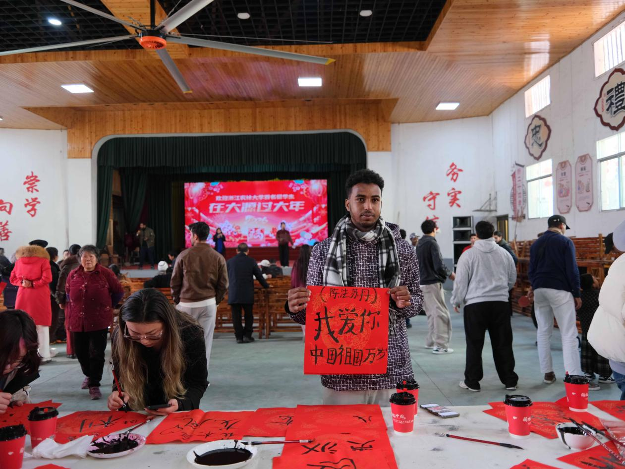 文化体验的旅程并未止步于美食。在大源村文化礼堂,褚建标、褚志平两位书法老师挥毫示范,留学生们手握毛笔,一笔一画临摹“斗福”与对联,墨香氤氲中体悟汉字的博大精深。
